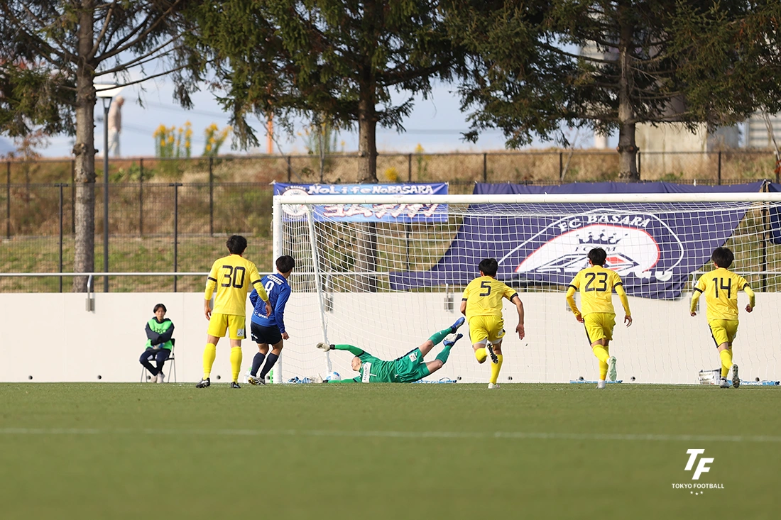 劣勢だった前半を無失点でこらえて、0-0で勝負の後半へ。東京Uはハーフタイムに10番伊藤と切り札の室崎を投入。反撃体制を敷いた。だが、反撃に出るはずが、後半開始4分に自陣最終ラインのパス回しで、CB弓氣田が安易にボールを奪われ、そこからのクロスボールをCB草住が激しく相手にぶつかりPKを献上してしまう。これを決められて0-1。