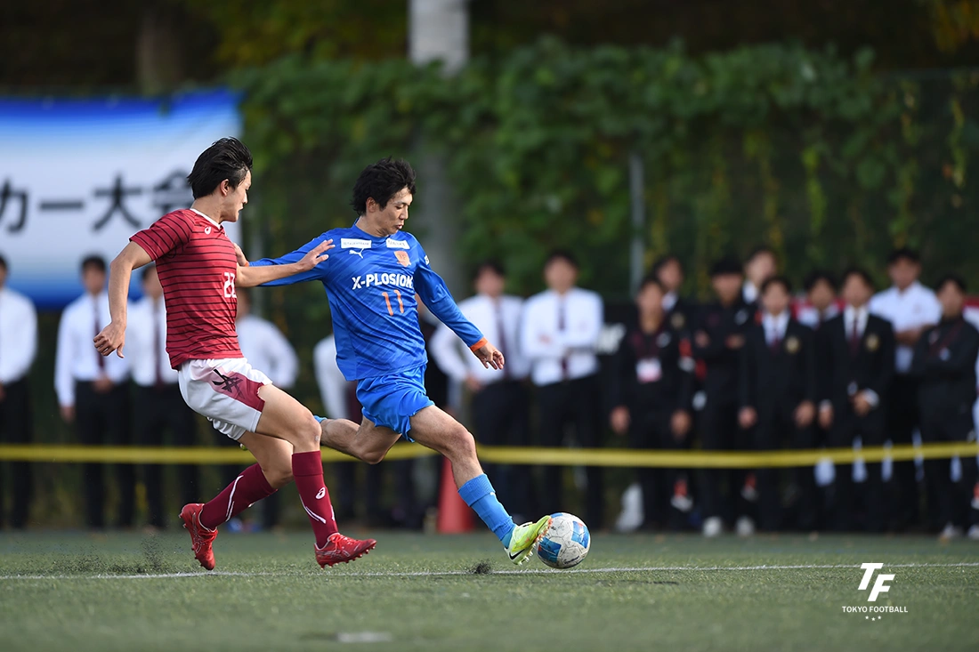東京1位のTOKYO2020と2位早大の対決は最後まで息を呑む熱戦となった。序盤から両者ともに集中した戦いを続け、ひとつのミスが致命傷になりそうな緊迫感を保ったままゲームは流れ、勝負は一瞬で決まりそうな予感。前半、前線にタレントが揃うTOKYO2020はFW麻生の縦パス1本から大竹が最終ラインを抜け出して決定機を迎えたが決められず。対する早大も青柳、小西、増川らを軸に組織で対抗し、華麗なパスワークから瀧澤がエリア内で決定機を迎えるなどチャンスがあったが仕留められなかった。
