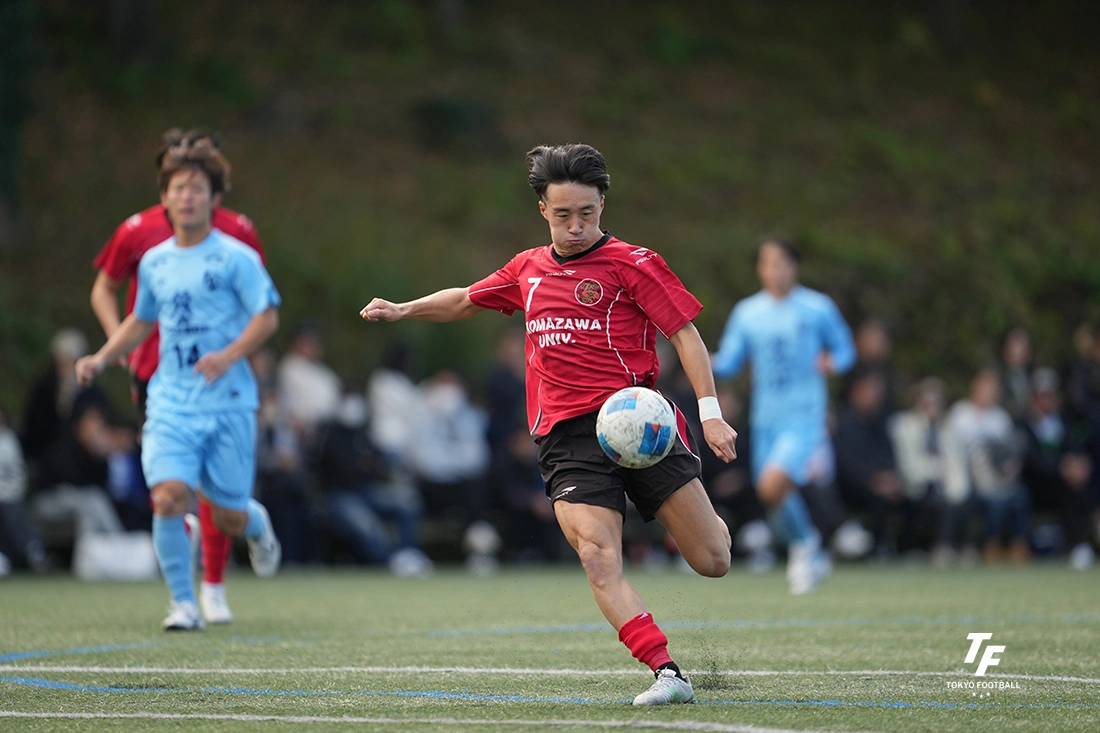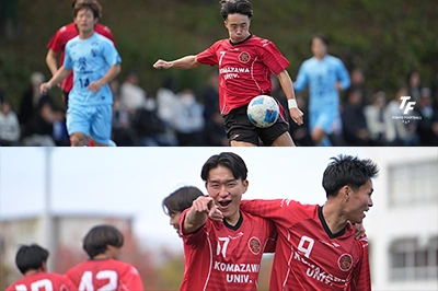 駒大GIOCOは前日の初戦に続き、早い時間での先制点。さらにこの日はすかさず追加点も挙げ、1年で関東復帰を目指すアヴェントゥーラ川口を相手に序盤からゲームの主導権を握った。「90分走り切れる自信があったので、ゲームの入りから思い切り行った」という主将のCB鈴木。