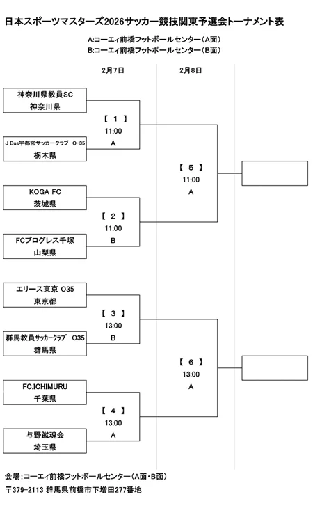 35歳以上による日本スポーツマスターズ2026関東予選会の組み合わせが25日に発表され、東京都代表のエリース東京over35は、1回戦で開催地の群馬教員SC O35(群馬県)と対戦することが決まった。