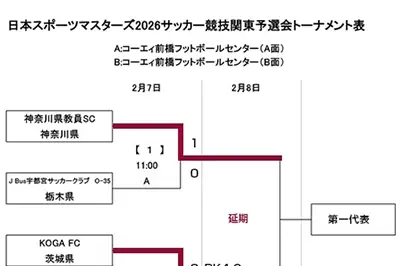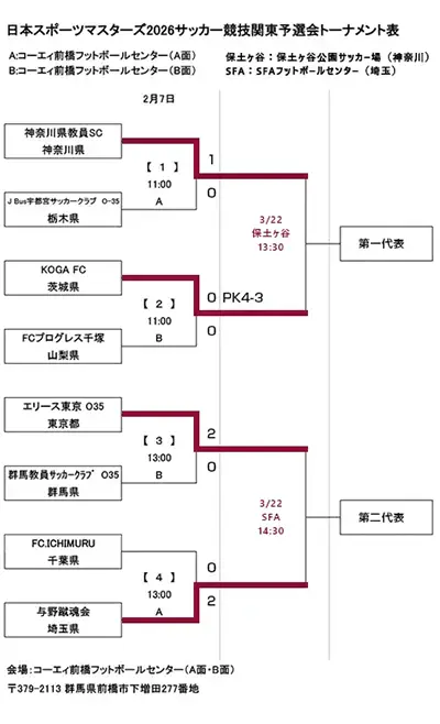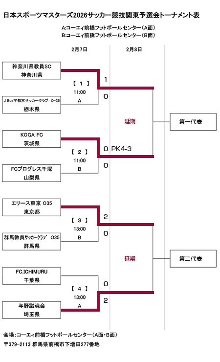 35歳以上による日本スポーツマスターズ関東大会(予選会/60分ゲーム)1日目は7日、群馬県前橋市・コーエイ前橋フットボールセンターで1回戦の4試合を開催。東京代表のエリース東京O35は地元の群馬教員O35と対戦し、野村良平、猪股聖哉の2得点で2-0で勝利。あすの代表決定戦に駒を進めた。エリースはあす、与野蹴魂会(埼玉)と戦い、勝てば2年連続となる全国大会出場が決まる。なお、もう一つの山は神奈川県教員SC(神奈川)とKOGA FC(茨城)が勝ち上がり、あすの代表決定戦で戦う。同予選は関東1都7県の代表8チームが4チームずつに分かれてノックアウト方式で戦い、各ブロックを勝ち抜いた1チーム(計2チーム)が9月に石川県で開催される本大会へ関東代表として出場する。