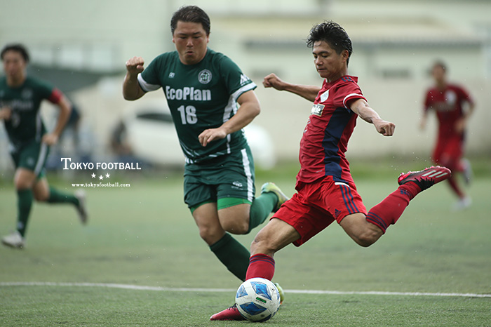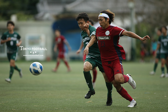 リーグ戦好調さらには先日クラブ選手権・東京大会でタイトルを獲り、チームは自信に満ちあふれているような立ち上がり。相手のロングボールをしっかり跳ね返す、鋭い出足のインターセプト、いずれも前への意識が高く、それが早々にゴールに直結した。11分、右SB鈴木の中央を駆け抜ける攻撃参加からスルーパスが出ると、それを政森がそのまま決めて先制。