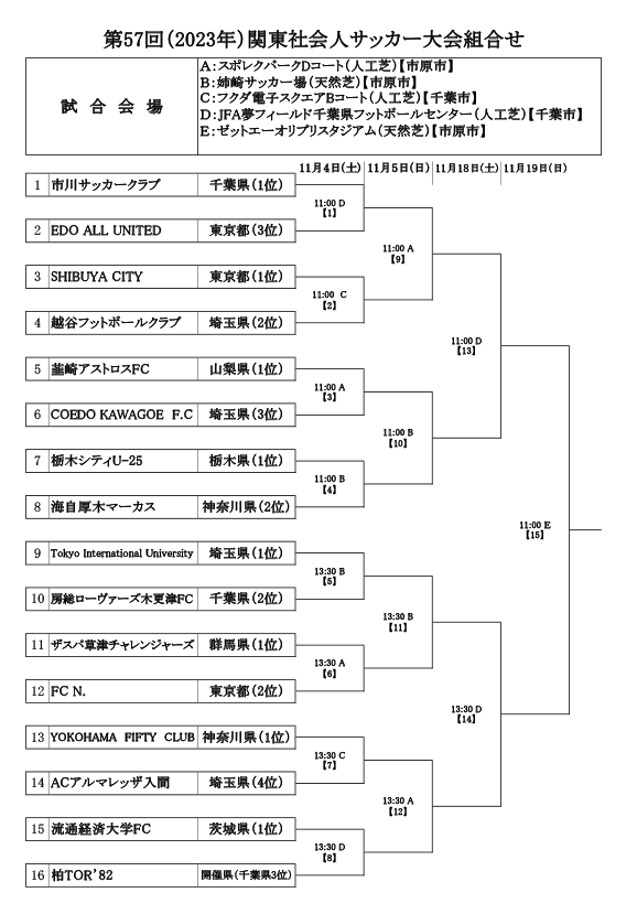 未定だった東京1位SHIBUYAの対戦相手は越谷FC(埼玉2位)に決定。また東京2位で出場のN.の相手はザスパ草津チャレンジャーズ(群馬1位)に決定した。