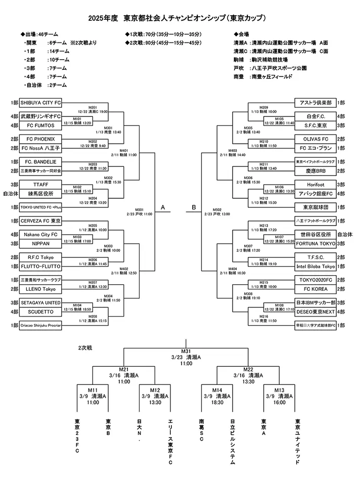 2次戦は来年3月9日からで、決勝は3月23日に清瀬内山運動公園サッカー場(A面)で行われる。