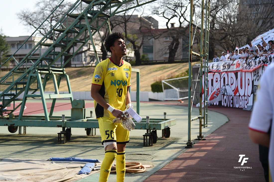 仕上げはGK若林だった。RB大宮アルディージャからの育成型期限付き移籍で加入している21歳になったばかりの守護神は、ここ岩手で出場機会を得て試合勘を取り戻しているところ。窮地を免れるPKストップは、前半の1失点を帳消しにして余りある、己を認めさせるに十分なビッグプレーだった。地元の東京都八王子市や埼玉県に近い武蔵野陸上競技場に集まった知己の人々、遠くから足を運んできたサポーターに「いいところを見せたい」という想いでゴール右に飛び、PKを止めた。