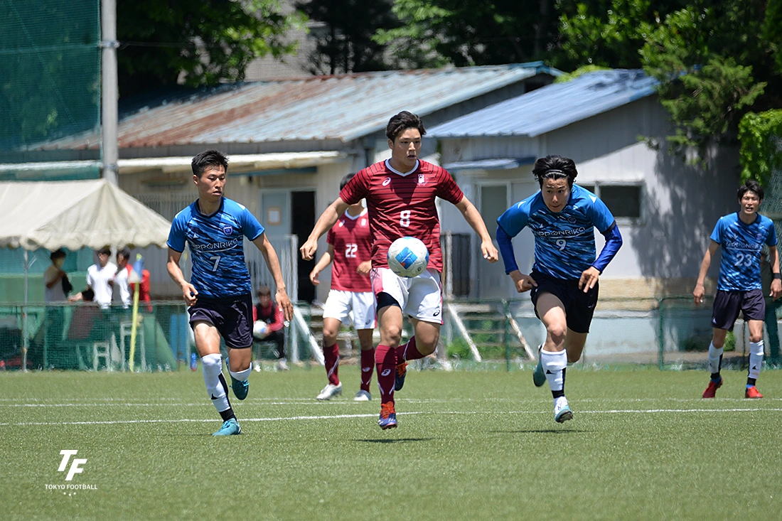 最初の20分間は互いのゴールを行ったり来たりの試合展開。しかしそれを過ぎると早大のペースになっていき、その優勢の時間帯に当然のごとく先制点が生まれた。中盤でボールをカットするとショートカウンター気味の攻撃になり、タテへの勢いそのままにMF谷口がクロスバーに当てたシュートのこぼれをFW瀧澤が押し込み先制。以後は主導権を譲らなかった。