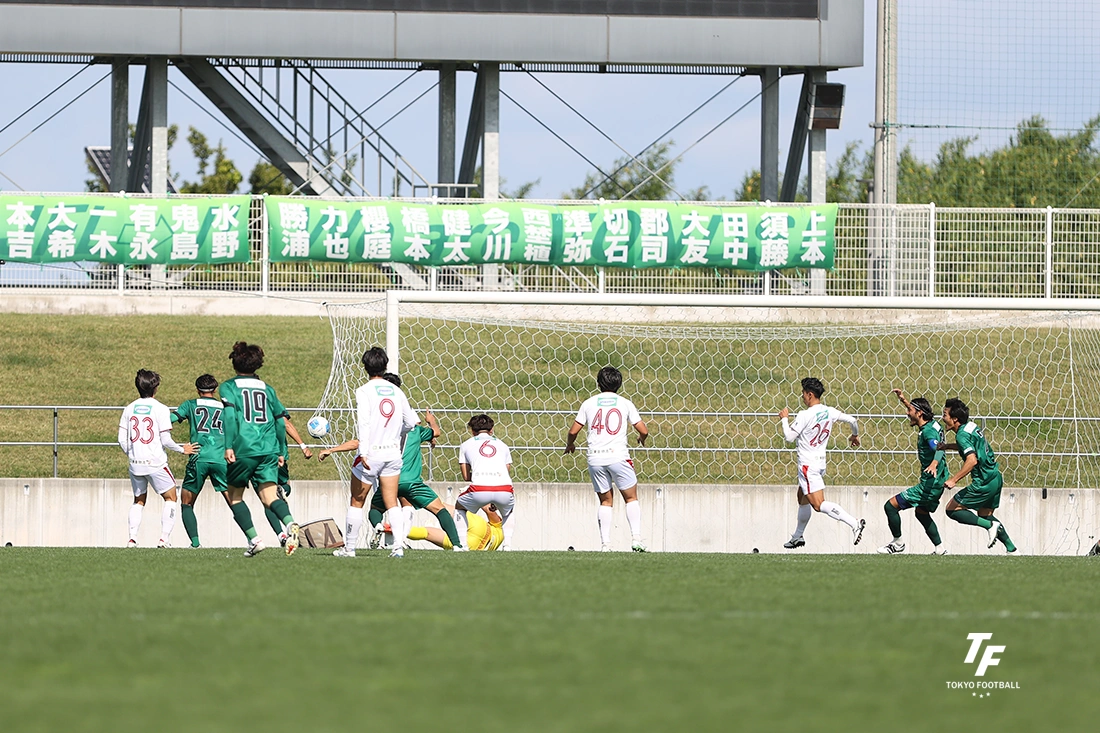71分、VONDSのGK今川がハーフライン付近から放り込んだFKのロングボール。最初に触ったのは東京23の梶山の頭だったが、前に弾き返せず、後ろに流れたボールをVONDSのFW加藤がとっさに現れて頭で押し込んだ。