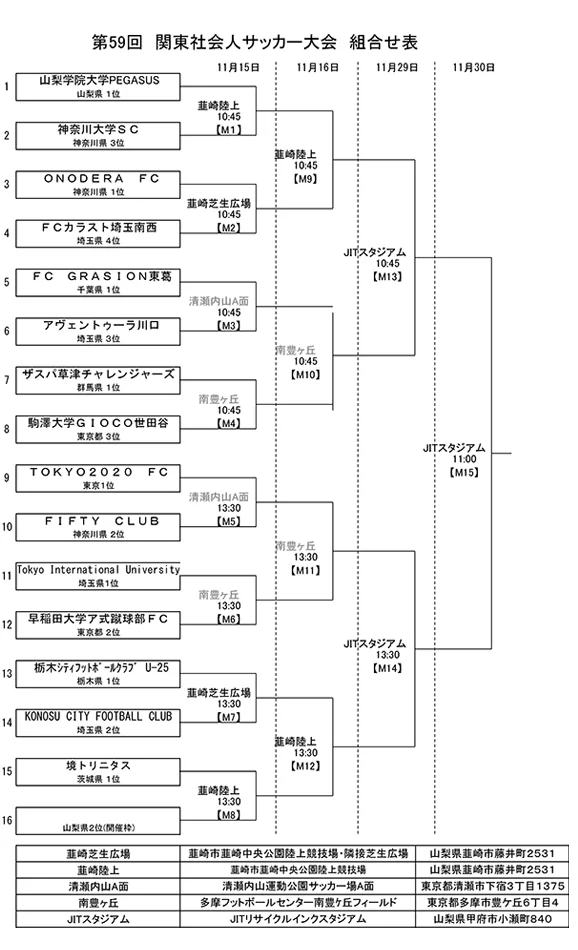 1回戦は11月15日、2回戦(準々決勝)は11月16日で山梨県と東京都で開催される。準決勝は11月29日、決勝は11月30日で、いずれも山梨県甲府市のJITリサイクルインクスタジアムで行われる。