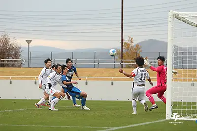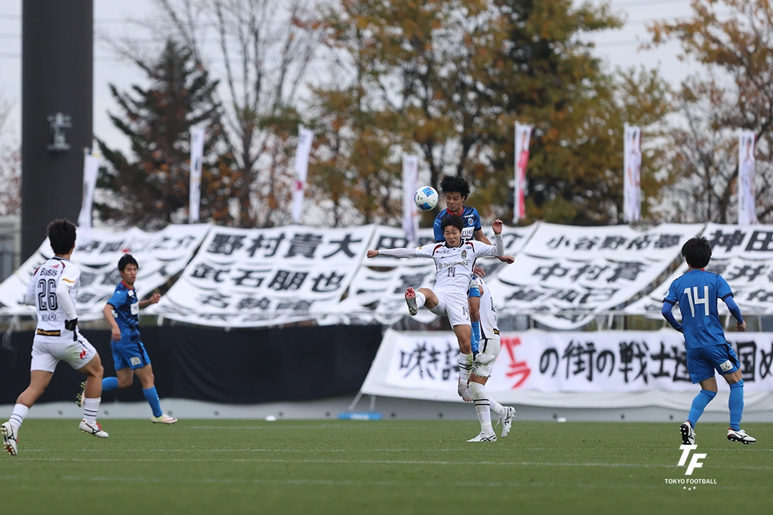 東京Uの決勝点となった1点は前半のアディショナルタイムに訪れた。右からのCK。和田が蹴ったボールを松久保がニアで競り、後方にそれたボールに誰よりも早く反応したのがCB箱崎だった。