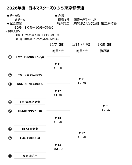 日本スポーツマスターズ東京大会の組み合わせが12日、東京都社会人サッカー連盟より発表された。