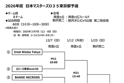 大会は35歳以上の8チームが出場し、ノックアウト方式で優勝を争う。1回戦は12月7日、準決勝は来年1月12日で、試合会場はいずれも多摩市・南豊ケ丘フィールドで開催。決勝は1月25日に世田谷区・駒沢第二球技場で行われる。