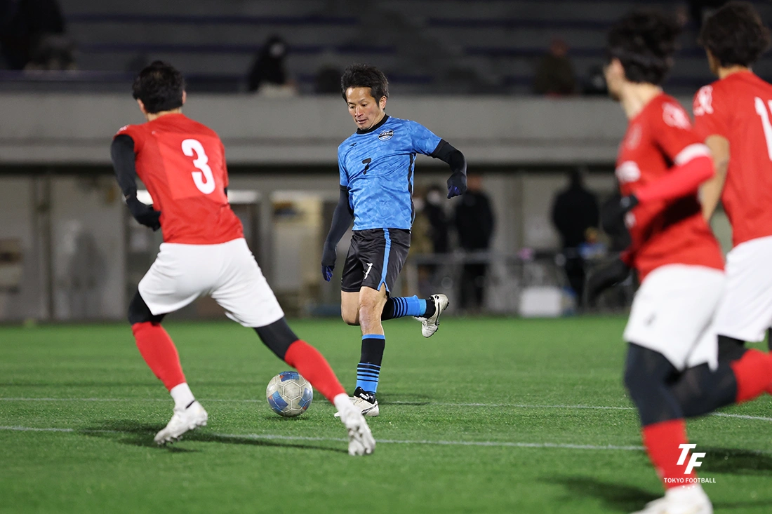 マスターズ初参戦でこの日2得点を挙げた元東京23FCの田村は「すごく楽しかった」と頬を緩めた。前線でボールを収めれば、周囲には元チームメイトの田仲、渡邉、猪股がいる。その仲間たちと連係し、自身は前半にクロスからヘッドで強引に押し込み、後半もこぼれ球を決めて2得点を挙げた。
