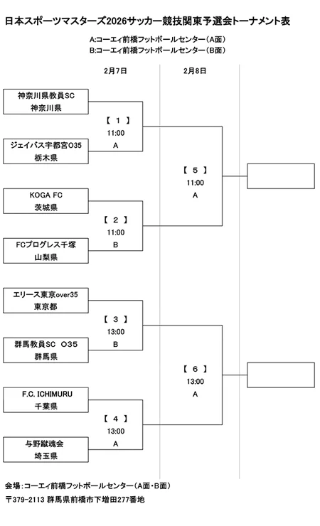 2月7日(土)13:00キックオフで会場はコーエィ前橋フットボールセンター(B面)。勝利した場合は翌日にF.C. ICHIMURU(千葉県)と与野蹴魂会(埼玉県)の勝者と全国大会出場をかけて戦う。