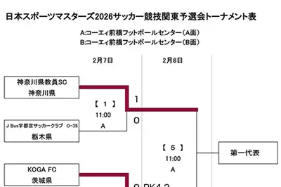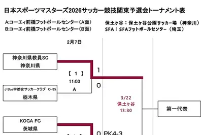 35歳以上による日本スポーツマスターズ関東大会(予選会/60分ゲーム)1日目は7日、群馬県前橋市・コーエイ前橋フットボールセンターで1回戦の4試合を開催。東京代表のエリース東京O35は地元の群馬教員O35と対戦し、野村良平、猪股聖哉の2得点で2-0で勝利。あすの代表決定戦に駒を進めた。エリースはあす、与野蹴魂会(埼玉)と戦い、勝てば2年連続となる全国大会出場が決まる。なお、もう一つの山は神奈川県教員SC(神奈川)とKOGA FC(茨城)が勝ち上がり、あすの代表決定戦で戦う。同予選は関東1都7県の代表8チームが4チームずつに分かれてノックアウト方式で戦い、各ブロックを勝ち抜いた1チーム(計2チーム)が9月に石川県で開催される本大会へ関東代表として出場する。